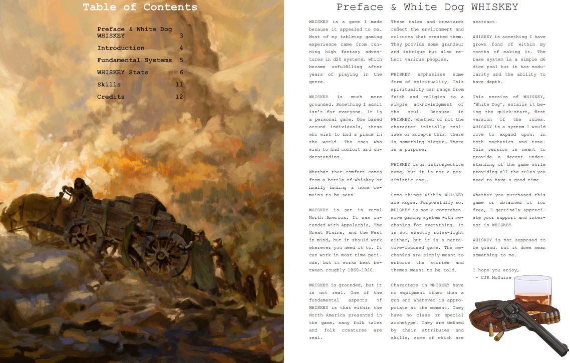 White Dog WHISKEY is an introspective tabletop roleplaying game about wandering, community, and folklore. Set in North America between 1860 and 1920, White Dog WHISKEY blends the human with the odd, including extrasensory perceptions and folktales as core parts of the game.
