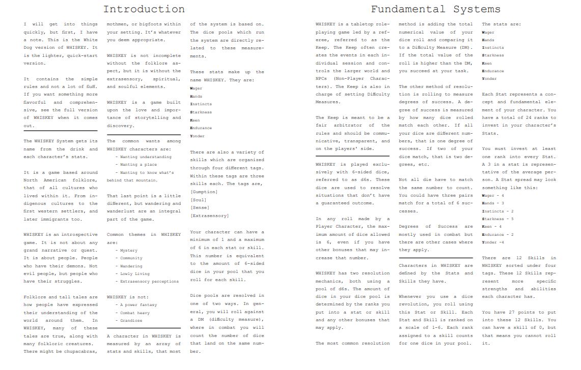 White Dog WHISKEY is more than enough to start playing, but it is a fraction of the larger game WHISKEY, which is not yet released. White Dog WHISKEY operates through d6 dice pools directly connected to your Stats and Skills.